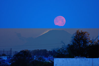 JUGEMテーマ:親爺の独り言 早起きの爺、昨日も3時ごろからパソコンに向かっていました。 すると、富士山に向かって満月が沈んで行くではないですか。 生憎、富士山は見えないものの、シルエット富士のパールが撮れればとシャッターを切りました。 よく見ると、満月が欠けている部分は雲でした。 別の夕陽の写真と重ね合わせた結果、明らかに、頂上の凹凸とは違います。残念!!!!!