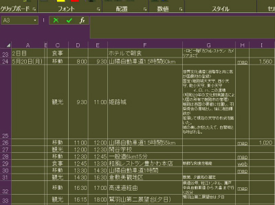 JUGEMテーマ:親爺の独り言 爺は、パノラマ写真を撮影する機械を制御するソフトウエアもexcelのマクロで組んでしまうほど、ことExcelに関しては詳しいと自負しています。 しかし、小旅行の旅程表を作った時に目からうろこの発見が! それは、Excelはシート(book)を編集するツールだということ。 今まで考えもしなかったことなんです。 例えば、WebページをExcelで作成・編集したとします。そして、サーバーにアップしてそのページを開いたときに一々Excelが起動してからWebページがExcelの中で開いたら(再編集も...