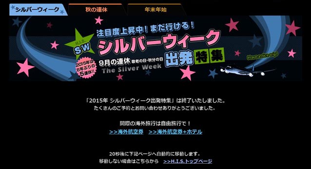 JUGEMテーマ:親爺の独り言 さあ!シルバーウィークだ!はりきってみました。 画像はH.I.Sさんのサイトのものです。 サイト:http://www.his-j.com/Default.aspx しかし、盛り上がりが、イマイチなんです。子供や孫たちもどこ吹く風って感じ。 爺「シルバーウィークだよ!何かないの?」「買い物に行ったって、シルバー割引があるわけじゃなし・・・・。」 爺「もう少し、シルバーにいいことないのかなーーーー。」 子「ゴールドに次ぐ、シルバーってだけでしょ!」 爺「あれ?色の問題かい・・・。」