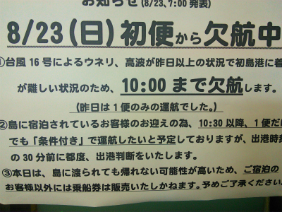 JUGEMテーマ:親爺の独り言 8月23日から2泊3日の初島行。 よりによって、台風が2個も。でも、15号が沖縄で16号が小笠原の当方。遠いこともあって、全く気に掛けず。 早朝の出発予定が、遅れて、熱海着予定が7時半ごろになってしまいました。 道路はスイスイで、7時半少し前に熱海港に到着。ほら、初島に行く船が止まってるよ。車を止めて、船着き場に行くも、まだ船がいる。 ?。もしかして? 11時ごろまで、待ってみましたが、初島港の状態が悪く運航の見通しが立たず。 代案は、食料の持参状況を考えれば、ホテルの選択肢は...