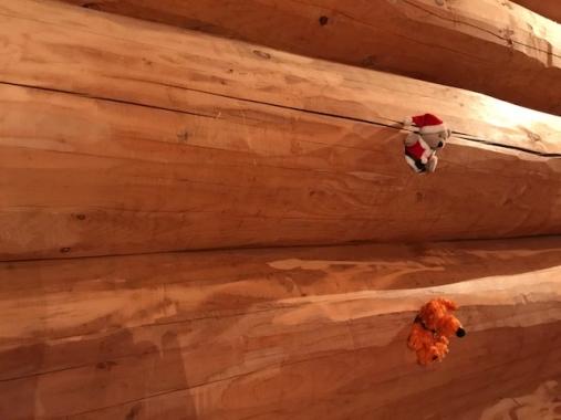 JUGEMテーマ:徒然なるままに。 ログハウスの 丸太の壁の補修が終わりました。 ボルトで止めるために開いた 穴が残っていて。 そこにクマさんサンタと わんこちゃんを 住まわせてみています ...