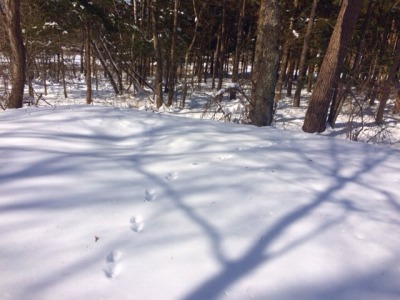 JUGEMテーマ:徒然なるままに。 日中に車でちょこっと 出掛けようと 外に出てみたら・・・。 林の向こうから続く 小さい(でもそんなに小さすぎない) 雪の上のあしあとを見つけました。 犬小屋に向かっている ワタシの足跡からくらべると 小さく軽やかな感じです。 このあしあとは 反対側の林の中へと 続いていました。 昨日の夕方、 日帰り温泉に向かう途中 高台の林の中から 道に出ようとしている 鹿...