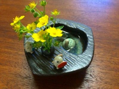 JUGEMテーマ:徒然なるままに。 原村ハウス前に かわいく咲いていた 小さな黄色いお花。 カメさんと小鳥さんと いっしょに飾ってみました 外ではこんな感じで 林の前に咲いていた 小さな小さな花でした。 外で咲いているのと 家の中で飾るのとでは すいぶん雰囲気が 違ってくるものですね 外でも中でも 新緑と野の花に癒されている ふたりと2ぴきです *今日のハニー&くっきー ↓ びゅ〜〜ん♪