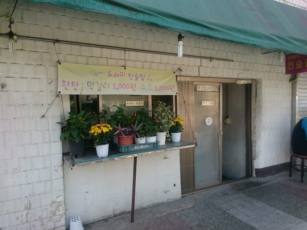 10月20日(日曜) 大好きな地域、チョンノサムガに 昼マッコリ飲みに出かけます ホテルから歩いて10分くらい まずはこちらのお店 「ドレミジャンスルチプ」 2回目の来店です 1000Wマッコリの立ち飲み店 ひしゃくでタンクから注がれると より美味しそう それでは昼マッコリ頂きます
