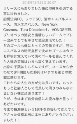 JUGEMテーマ:清水エスパルス 『【トップ】柏瀬 暁 選手 引退のお知らせ』(ブリオベッカ浦安公式 2018/12/25) この度現役を引退する事に決めました! いきなりの報告になってしまい申し訳ありません。 船橋法典FC、フッチSC、清水エスパルス、New York Cosmos、Turu Düsseldorf 、VONDS市原、ブリオベッカ浦安、そしていままで僕に関わってくれた全ての皆様にありがとうと言いたいです。 ここまでサッカーを続けてこれたのも本当に皆様の支えがあってこその事でした。 本当にありがとうご...