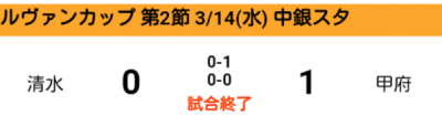 JUGEMテーマ:清水エスパルス 【入場者数】 4,585人 【得点】 30分 森 晃太(甲府) 【出場選手】《清水のみ》 GK 西部 洋平 DF 清水 航平 DF 角田 誠 DF 二見 宏志 DF 兵働 昭弘 MF 六平 光成 MF 増田 誓志 (→46分 MF 竹内 涼) MF 村田 和哉 (→54分 FW 北川 航也) MF 楠神 順平 (→74分 MF 滝 裕太) FW ?橋 大悟 FW 鄭 大世 【警告・退場】 57分警告 清水 航平(清水)【距離不足】※累計1枚目 ...