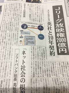 夜勤だった明け方にツィッターで読んでビックリだったので、帰りに日経新聞を購入。 放映権料を高く売れたのは良い事に違いないけど、個人的には今のJリーグがこの金額に見合っているかというのは大きな疑問。それに、年間200億円超というクオリティーは無いと断言できる。本来、リーグ本来の価値を上げる努力(魅力ある選手を呼べるような土壌作り、ジャッジの向上、経営努力をしているチームがよりお金を集めやすいようになるようにする→具体的には株式上場等)と、素人でも思い付く事が沢山ある。それに、ネット環境で...