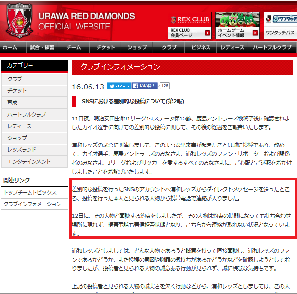 パトリックのと含めて2年連続2回目。スタジアムの外で起きた事は罰則の対象外らしいけど、スタジアム内でSNSに投稿した可能性は大いにあるし、何よりこういう差別論者は、日本の恥。最近、ヘイトスピーチへの法対応強化が報道されているけど、そろそろ考えるべき時期では?? チェアマンが浦和サポだったのは分かるけど、正直対応が甘すぎる。だから、「また」浦和サポからこういう輩が出てきた。戦うのはピッチ上だけで十分。 JUGEMテーマ:Jリーグ