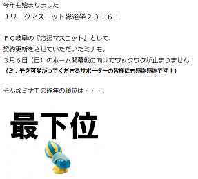 JUGEMテーマ:Jリーグ どうも★ Jリーグマスコット総選挙2016 J2キャラのTwitter選挙活動を 振り返る企画も今回で7回目。 さぁ、いってみよう! ミナモ Jリーグマスコット総選挙2016の投票がスタート!ぜひ、FC岐阜応援マスコットのミナモをセンターポジションに!投票はこちらから→https://t.co/AGW2ByULUH #ミナモJマスコット総選挙 #fcgifu #FC岐阜 pic.twitter.com/NKX2htDzHD — FC岐阜 (@fcgifuDREAM) 2016, 1月 26 最初は、クラブ公...