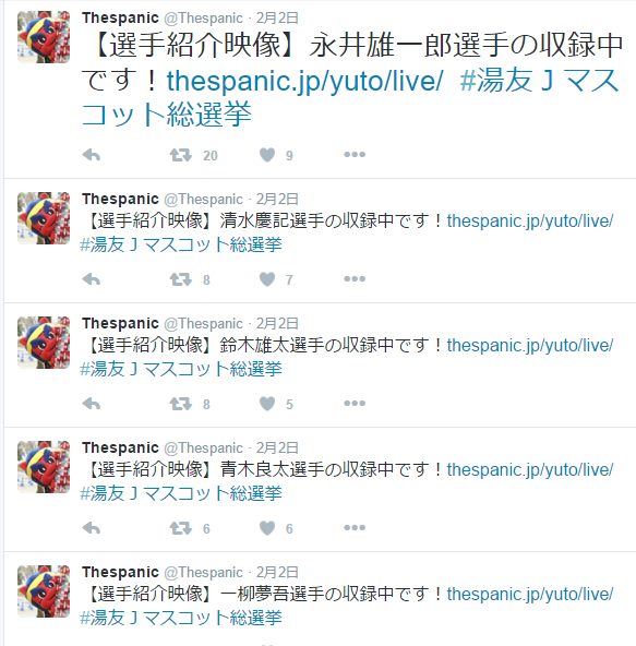 JUGEMテーマ:Jリーグ どうも! Jマスコット総選挙2016の マスコットたちの選挙活動を 振り返る企画第3回目です! さっそくまいりましょう! ホーリーくん 水戸は、Twitterでの選挙活動を ほぼ行わず。 [ニュース]Jリーグマスコット総選挙2016、投票は明日17:59まで! https://t.co/akBunNptga #hollyhock pic.twitter.com/C8PIjDW8Vm — 水戸ホーリーホック (@hollyhock_staff) 2016, 2月 11 最後の最後に期日を投げただけで 終了でした。 [全力1万...