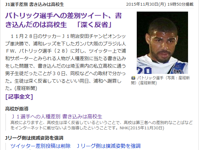 今のチェアマン就任して、何をした?という位功績分からんけど、数少ない功績が差別行為への対処。 これからの世の中は「ダイバーシティ」の時代、多様性を認め合わないと。 ちょっとこれはアウト。刑事告訴もん。 JUGEMテーマ:Jリーグ
