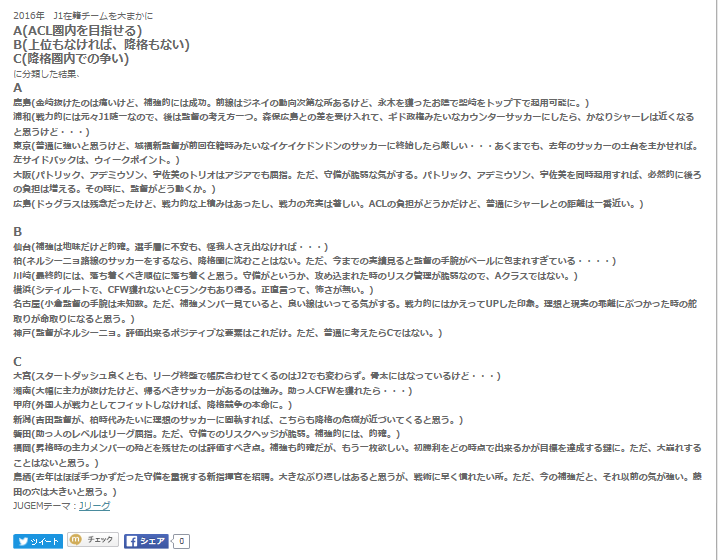 4節終わって、2分2敗。色々な意見はあって良いと思うけど、そんなに悪くないと思う。認識しないといけないのは、アビスパはJ1ではあくまでも18番目のチームだという事。昇格決まった時から、井原監督も言っていたけど、足元を見てないと、上ばかり見ていたら結果で失敗するのは明白。 シーズン前に、こういう事したけど、まだ上記の評価に大きなズレはない。で、これに当てはめて考えると、 Aクラスに、1敗 Bクラスに、1分 Cクラスに、1分1敗 個人的に、エースが『てっぺん目指す』と言ってた鳥栖に負けたのは、今シーズンの勝...