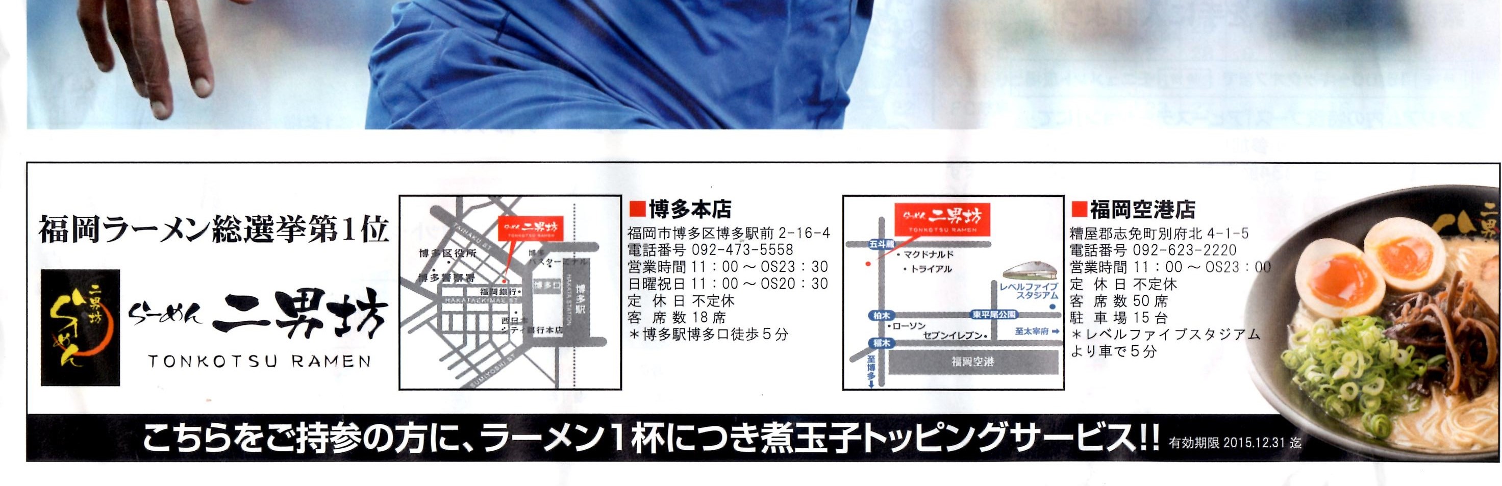 アビスパのマッチデーニュース表紙下部にいつからか載りだした「マッチデーニュースご持参の方に煮玉子トッピングサービス」の文字が気になり、磐田戦必勝を期して、昨日の試合前訪問。 店のデータはこちら。普段北九州界隈のラーメンがホームグラウンドな自分からしたら、博多のラーメンは訪れないと食べんけど、悪くない感じだった。何か、あの玉子がけごはんは忘れられん味やった〜 アビスパファンと言わず、レベスタ訪れる方は是非^-^ JUGEMテーマ:アビスパ福岡 JUGEMテーマ:福岡のラーメン JUGEMテーマ:ラーメン