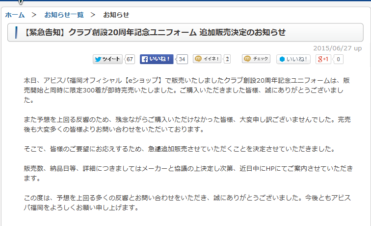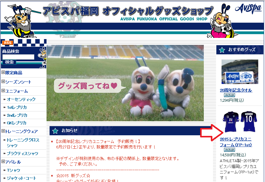 12時。TOP画面に無し。リロード繰り返す 12時4分。ツッィターで買えた情報を沢山見たため、左のユニフォームページからアクセス。 この表示じゃ分かるはず無い。販売者、正直言って馬鹿ヤロ。 JUGEMテーマ:Jリーグ JUGEMテーマ:アビスパ福岡