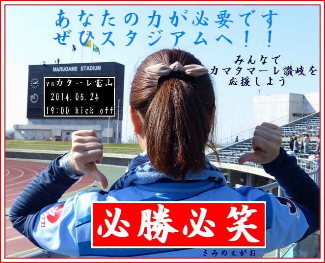 JUGEMテーマ:カマタマーレ讃岐絶対に負けるわけにはいかない戦いが目前に迫っています、今こそみんなの心を一つにしてカマタマーレ讃岐の応援を。スタジアムで選手達に声援を送ろう!恥かしくて声を出せない方もいるでしょう、でも大丈夫スタジアムに足を運ぶだけでも大きな後押しになるのです。選手達に しっかりと届いているはずです。一人でも多くの方の後押しが必要です。どうかよろしくお願いします。vs カターレ富山2014.05.24(土)19:00 キックオフin 丸亀競技場皆さまのご来場を心からお待ちしております♪行きたいけどどうし...