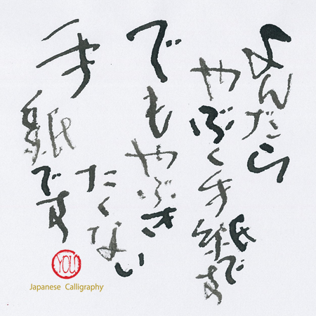 本日のお題は、 「よんだらやぶく手紙です でもやぶきたくない手紙です」 竹久夢二の「手紙」より。 朝から 福島で強い地震。 津波警報まででた。 何事もなければ良いが。 律子さんへの手紙はコチラ JUGEMテーマ:書と手紙と水彩画と墨