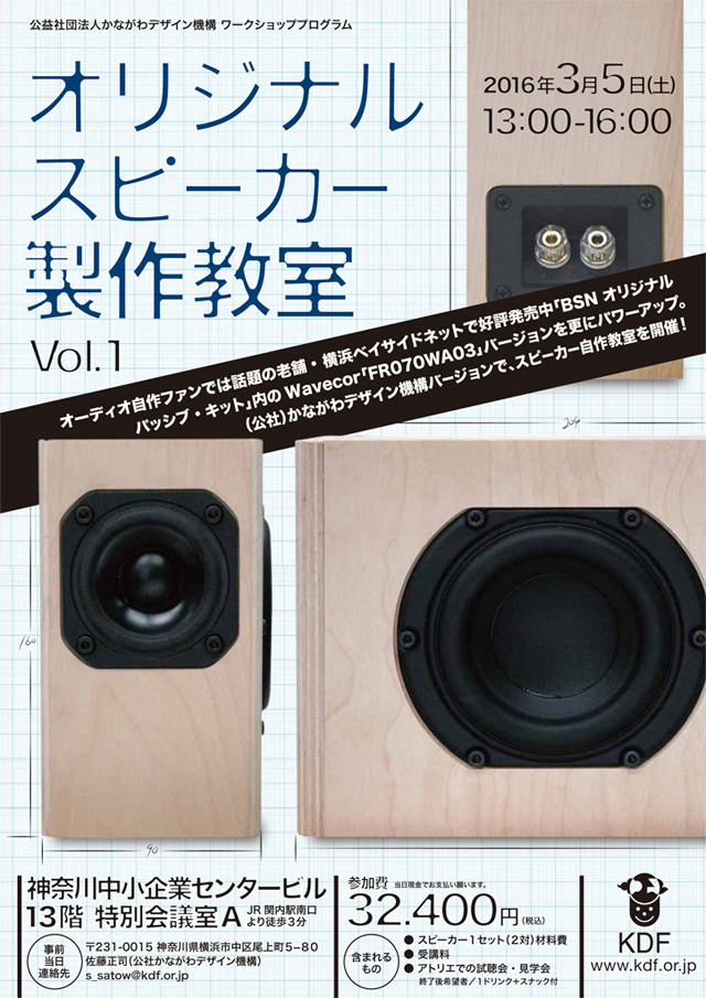 JUGEMテーマ:暮らしを愉しむアイテム 当ショップの『YBAプレミアクラブ有料会員』の佐藤さんが、来たる3月5日(土)に、ご自身が所属している『公社かながわデザイン機構』主催による『オリジナルスピーカー製作教室(Vol.1)』を開催するそうです。 佐藤さんは、当ショップの古くからの会員で、これまでは、アンプなど『超』の付く自作マニアとして、当ショップの中でも、レベルの高い会員さんだったのですが、昨年、思い切って『脱サラ』(今となっては死語ですか?)し、現在は、オーダーで、アンプやスピーカーの設計・制...