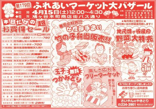 JUGEMテーマ:ふとん いつも当社のHPやブログをご覧いただきまして誠にありがとうございます。<(_ _)> 今日は、鳩ケ谷本町商店街の第179回ふれあいマーケット開催日です。(^o^)丿 ◆商店街女性部のタケノコ弁当販売・・・12時頃〜 ◆たまごつかみ取り・・・15時〜吉田クリーニング店前 ◆地元鳩ケ谷産の野菜大特売・・11時〜笠原鷗文堂前 ◆フリーマーケット・・本町バス通り ◆各店の大特売・・・本日限り! 遊びにおいでよ!ふれあいマーケッ...