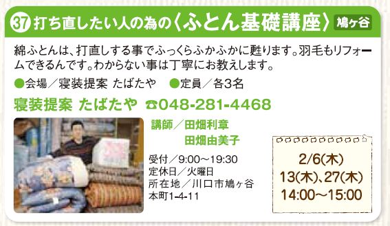 JUGEMテーマ:ふとん みなさんこんばんは♪(^◇^) いつもたばたやのHPやブログをご覧いただきましてありがとうございます。<(_ _)> いよいよ明日・・・・川口【まちゼミ】のチラシが折り込みされます。 そして、受付の開始です。 記者会見も行われました。 詳しくは、こちらをご覧くださいませ。。。(^-^*)/ ↓ ↓ まちゼミのHPはこちら♪ 当店も参加します。(^-^*)/ お気軽にご参加くださいね♪(^-^*)/ ふとんのことなら!たばたやにお任せください♪(^-^*)/ ご注文やお問い合わ...