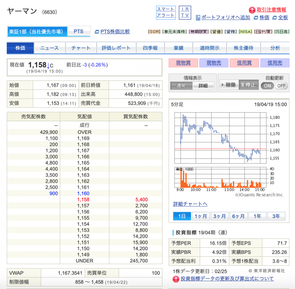 今週から著者の独断で値上がり予想をしていきます! 現在(2019/4/22)の値段から上昇しているか否かを、読者の方と一緒に見ていきたいと思います^^ 週末(2019/4/28)までに上がっていれば○、下がっていれば✖で判断します。 ★ヤーマン ★ヨータイ ★ゲンダイエイジェンシー