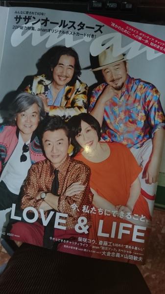 JUGEMテーマ:幸せなお金と時間の使い方 マガジンハウス社の代表雑誌、「anan」。 昔から週ごとにとってもお洒落だったり、時には過激すぎるとも思われたり、その逆で、雑誌にしておくにはもったいないくらい重厚で濃密な社会テーマだったり・・。 世間をにぎわし、社会現象をも巻き起こしてきた雑誌ですよね。 今週はそんな雑誌、「anan」のテーマはずばり「LOVE&LIFE」です。 そして、このテーマのこの回の表紙とロングインタビューは「サザンオールスターズ」。 何を隠そう、...