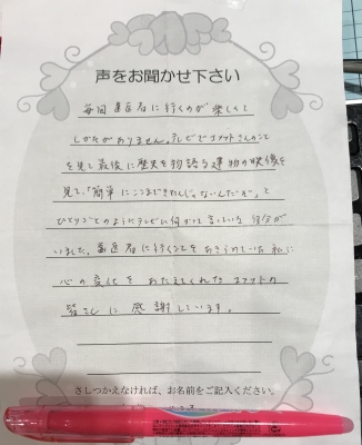 JUGEMテーマ:歯科 JUGEMテーマ:幸せなお金と時間の使い方 本好きの患者様Kさまをお迎えに行くと、必ず 「今、どんな本を読んでますか?」とお聞きします。 Kさんは,今は子育ても済んで、仕事からも解放されて 時間の余裕は心自由に読書や手芸等などを中心に日々の生活を楽しまれています。 昨日、Kさまからの声が「ご意見BOX」に入っていましたのでご紹介します。 「毎回、歯医者に行くのが楽しくてしかたがありません。 テレビ(番組)でコメットさんのことを見て、 最後に(コメットの...