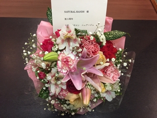 JUGEMテーマ:イタダキモノ。プレゼント。 明けましておめでとうございます、NATURAL HANDSオーナーの松坂です( `・ω・´)ノ 本日から営業してますが、実は昨日でサロンの3周年でした。 んで今日早速NuageのF本さんからお花が届きました! じゃじゃ〜ん♪ ピンクベースでかわいいですヽ(´∀`ヽ) 毎年お花届くのでうれしいんですよ! 長持ちさせるようがんばるぞっ F本さんありがと〜(´∀`*)ノシ 年末年始のネタはまた違う日にブロ...