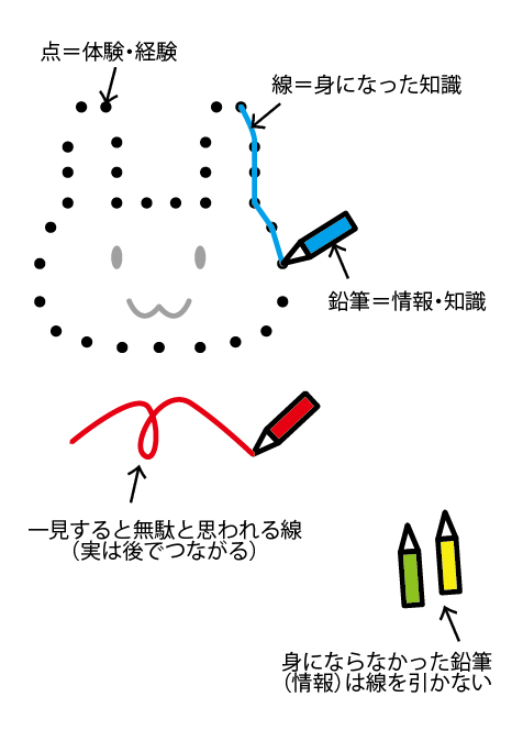 ちょっと備忘録というか、 自分の脳内を整理する意味で図を書いてみました。 先日、自分の体験は点で、外部からの情報はノリって書いちゃったんですが、 よく考えたら点をノリでくっつけていったらダンゴ状になるじゃんか(-_-;)と思い直して 「線」に書き換えました。 子供用の点つなぎパズルがイメージとしてピッタリです♪ さあ、完成したらどんな絵が出来上がるかな?