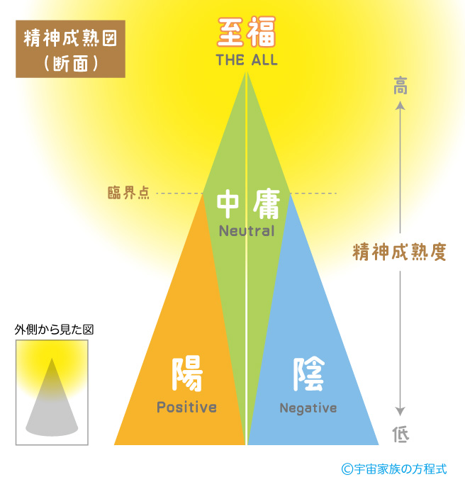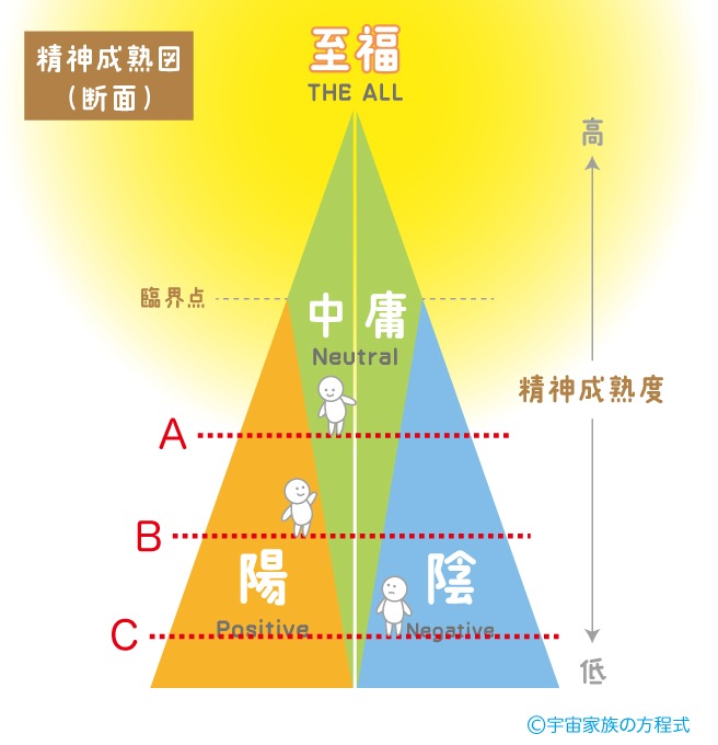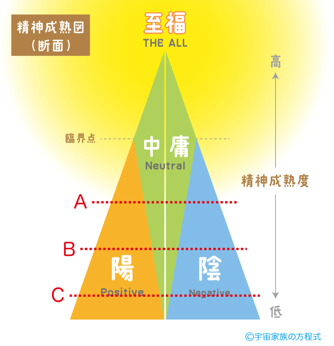 【精神成熟図】を詳しく説明していきます。 この図は、精神の成熟度をビジュアルでわかりやすくしたマップです。 単純に上へ行くほど精神は成熟され、 下へ行くほど精神は幼いということになります。 頭が良い、地位が高い、ということではありませんので、 大人よりも子供の方がレベルが上、 ということは当然のようにあり得ます。 * <成熟度によるそれぞれのエリア> A、B、Cの位置で、ヨコにスライスしてみましょう。 &n...