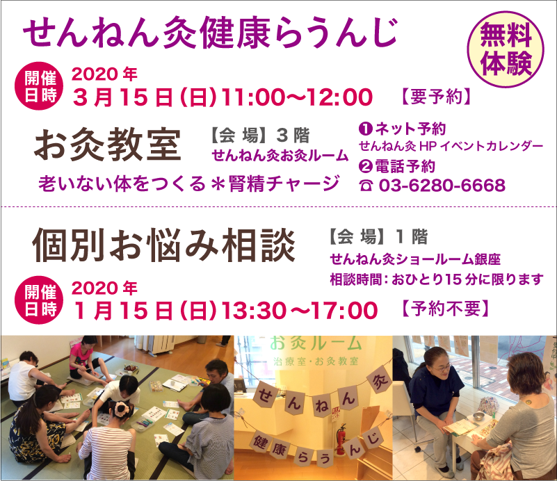 現在、新型コロナウイルスの影響により、多くの皆様が感染の不安を抱えながらお過ごしのことと存じます。 せんねん灸お灸ルームでは、毎月1日、日曜日「せんねん灸健康らうんじ」を開催しています。 今月は3月15日(日)に開催いたします。 いつもであれば3回お灸教室を開催していますが、今回は1回のみの開催です。 当日、ご来室いただけない皆様にも、お灸教室を楽しんでいただけるよう準備中です。 ●マスク着用が長期化しつつあり、首こり、肩こ...