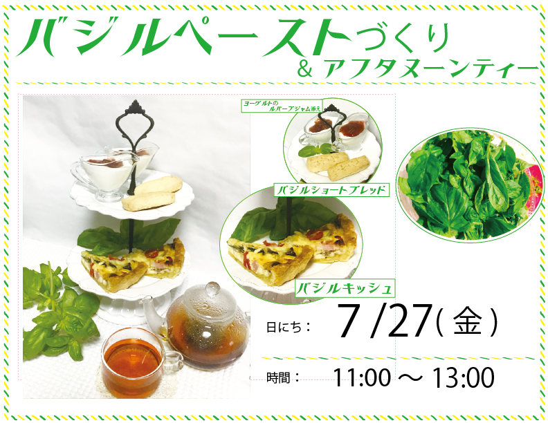 昨年も好評いただきました、 今が旬✨!バジルペーストづくり♪ 夏が旬のバジルは夏バテの気になる今の時期にぴったりのハーブなんです! 心身及び中枢神経に働きかけ、身体のさまざまな機能を高めてくれる効果や、 身体を温める効果もあるので冷房で冷えすぎてしまう冷え性さんにもオススメです! これから本番を迎える夏を前に バジルのパワーをたっぷり頂いちゃいましょう ◎●◯◎●◯◎●◯◎●◯◎●◯ 7/27(金) 11:0...
