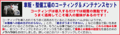 JUGEMテーマ:カーコーティング 最近では大部分の車販・整備工場でコーティングを扱われるようになりました。 しかしその実態は・・・? と言うと、あまり積極的にされていないところが多いようです。 現在扱われているところでも、コーティングはそこそこ勧められているようですが、 メンテナンスに目を向けられているところはほぼ皆無と言っていいのが現状のようで す。 実はこのメンテナンスがコーティングにとって一番重要なのです。 この、コーティングとメンテナンスをうまく活用することによりお客様の...
