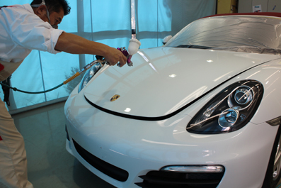 今日のお仕事!お車はポルシェ・ボクスターさん!都内のお客様よりご用命いただきまして、ガラスコーティングの施工中です^^専用スプレーガンを使っての吹きつけ施工。均一なガラス膜を造っています!^^ バンパーなどもボディ全体をコーテイング!仕上げといったら、店長の野沢氏・・・・^^顔がボディに付きそうなくらい至近距離でのチェック!ボディだけでなく、ドアの内回りや細部も入念にチェック中です^^赤いフォロがホワイトパールに映えて、素敵ですね〜^^なんともエレガントなボクスターさんです!^^カッ...