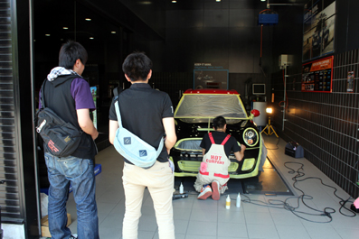 暑さでセミ君も落っこちて来る程の・・・・^^:いいお天気に恵まれた本日!「ミニ甲府」様のスペースをお借りして、ボディ磨きのデモンストレーション、ボディコーテイングのご案内、さらに、手洗い洗車のレクチャーなど丸一日お邪魔してきました!そうそう、ミニ甲府様とのコラボレーション企画「ボディコーテイングキャンペーン!」7月末までの予定でしたが、ご好評いただきまして、8月末まで延長となりました!(パチパチ)デモンストレーション第二弾!ということです!^^vやはり、今回も「洗車レクチャー」は大人気!...