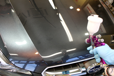 今日はチョット渋めカラーのスバル・インプレッサセダンさんがクオーツガラスコーティングでご来店中です。ガンメタ!今は言わないのかな〜^^;クオーツガラスコーティングのスプレー工法は均一なガラス膜を造るためにエアーガンを使います。実際に塗装を吹き付けるガンと同じものを使いますが、クオーツガラスコーティング仕様に一部改良しています。塗料よりもコーティング剤の方が粘度が少ないので、さらに細かく霧状に吐出出来るようになているんです。得意としているのが細かいグリルなどの隅っこ!ハニカムのようなグリ...