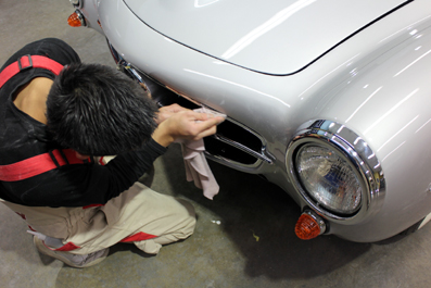 さて、ボディの鏡面磨きも終わりまして、細部の仕上げ、そして外したパーツの取り付け作業に入りましたベンツ190SLさんです。 緊張感マックスのバンパー取り付け作業中!ドキドキですね〜^^;外したエンブレムやパーツもピッカピカに磨きこんで。綺麗にレストアされているエンジンルームその周りもさらに綺麗にお掃除。驚くほどメッキパーツも綺麗で、ボディの鏡面仕上げと共に細部まで引き立っています!^^ボディはやや歪みがありますが、当時の面影が残っていてこれはこれでいい味ですね^^どうですか!このデザイン!やっ...