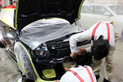 さあさあ〜今夜も磨きの準備を整えて、これからブラック/レッドのミニ・クラブマンさんのボディ磨きが始まります^^ボディ磨きをする上で、はやり段取りが大事!その中でも、マスキングは手間が掛かりますが、欠かせない作業の一つです。ボディ磨きで触ってはイケない所やホコリが入りこないようなに工夫しながら養生をしていきます。ボディ磨きは基本塗装面ですから、はっきり言えば塗装面以外の場所はマスキングするということdす^^マスキングやザラつき取りを行なって、いざ塗装肌の調整開始!お車は新車ですが、新車以上...