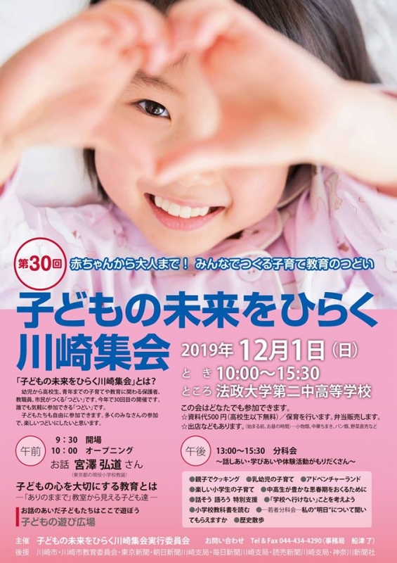 2010年12月1日(日)10:00〜川崎市中原区にあります「法政大学第二中・高等学校」を会場にお借りして、「第30回子どもの未来をひらく川崎集会」が開催されます。 市民の有志による実行委員会が主催、川崎市(行政)や川崎市教育委員会、神奈川新聞社、読売新聞川崎支局、毎日新聞川崎支局、朝日新聞川崎支局、東京新聞の後援でおこなわれます。 今年は『「特別の教科 道徳」ってなんだ?』の著者であり小学校の教師である宮澤弘道さんにメイン講演をおこなってい...