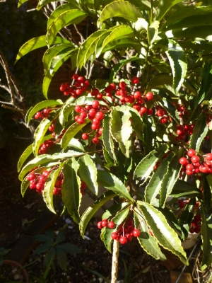 JUGEMテーマ:季節の出来事 JUGEMテーマ:雪 重い雪 跳ね除け起きて 輝けり 昨日横浜にも雪が降りました 今迄暖冬だったので、寒さが益々身に滲みています 雪の後雨に変り、でも雪を解かしきるほどの雨量ではなかったので 反って雪が重くなり、午後からの雪掻きが大変で…(涙) 今日は一転晴天(*^^)v とは言え、気温が低いので、日陰は凍結してしまってて(>_<) でも、倒れていた万両が起き上がり、日の光に照らされ輝いている姿を見て 心明るくなりました(*^^)v この冬、千両・万両共に実の付き...