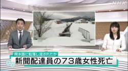 JUGEMテーマ:雪 「NHKオンライン」→「各地のニュース」→「富山」を選択→「もっと読む」 →「新聞配達員の女性が川の中で死亡 1月12日 19時52分」 2021.01.12(火)の他のニュース >>