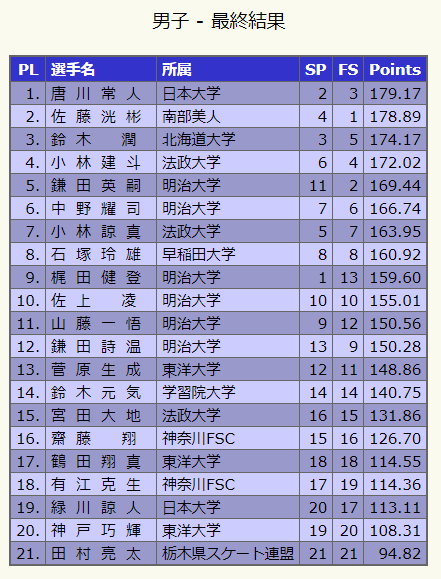 JUGEMテーマ:フィギュアスケート 日本シリーズ福岡の陣が始まって、野球脳になる前に(笑) スケートの話題をもう1つだけ。 先週末に東日本選手権が行われました。 シニア男子の結果はこちら。 東日本から全日本へ進めるのは、8位 石塚玲雄くんまでです。 私が東日本の選手に会えるのは、飯塚杯くらい。 飯塚杯で見て応援できた、明治のカジケンくん、佐上凌くん、いちご君、 法政の・・・というか福岡出身の宮田大地くん。同じく九州...