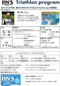 【FIN'Sトライアスロンスイムセッション体験会】香川県高松市で6月にオープンするFIN'Sトライアスロンプログラム。オープンに先立って、5月6日(火・祝)にスイムセッション体験会を実施します。前半はスイム実技で、後半は座学を行い、様々な質問にお答えして行きます。参加費は1000円ですが、即日入会者には参加費をお返しして、入会金0円とFIN'Sオリジナル水着かセームタオルをプレゼントします。好評により定員30名をオーバーしましたが、枠を増やして参加可能になっています。実技は、オープンウォータースイムの実戦やワンポイン...