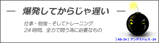 24時間のストレスを跳ね飛ばす!完全なるコンディション調整!【AS-24】 アンチストレス-24新登場♪仕事、勉強、そしてトレーニングやスポーツ。カラダやメンタルには容赦なくストレスがかかっています。 徐々に体調を崩していく場合もあれば、突然崩す場合もあります。日々の疲労対策が出来ている様でも、目に見えないストレスは蓄積され体調を崩す原因となります。日常生活の各シーンにおいてストレスを撃退する優れたサプリメントをお求めやすい価格にてセットにしました!