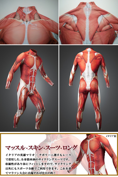 真面目で楽しいスーツが登場です♪■ マッスル・スキン・スーツ (詳細はこちらから)速乾性・伸縮性に優れた全身筋肉柄のサイクルスーツ。イタリアの英雄マリオ・チポリーニ選手もレースで着用した、全身筋肉柄のサイクリングスーツです。収縮性があり体にフィットしますので、サイクリング以外にもスポーツ全般でご利用できます。これを着てマラソン大会に出場すれば注目の的!タンクトップや短パンと組合せるなど、着こなしも色々と楽しめます。ウエイトトレーニングをする時にもこれを着て、鍛えている場所を鏡で確認すると「効か...