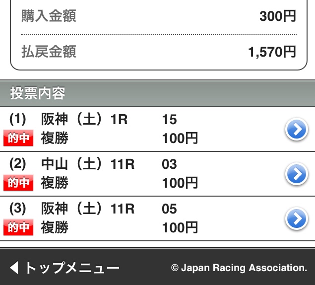 日曜阪神9R マイネルウィルトス 5番人気 2着 予想通りの結果に^ ^ 次はちょっと人気しそうなので、見送りでしょうか。 そして勝った方のマイネルフラップが大穴。単勝152倍のブービー人気。こっちのマイネルかい!笑 複勝2180円もついとる! 複勝狙い馬人気 集計 (1着.2着.3着.4着.5着.6着以下) 単勝1〜4番人気複勝 (1.1.1.1.0.3) 単勝5〜10人気複勝 (0.4.0.2.0.3) 単勝11番人気以下複勝 (0.0.0.0.1.2) 有馬記念はは、ブラストワンピースの...