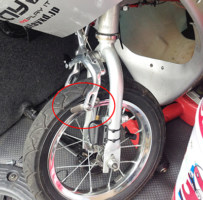 ジェット自転車乗っててブレーキに不安感じてた。 フロントは肉厚の薄いキャリパーブレーキで、全開からフルブレーキすると、ブレーキもげそうになってるし、 リアに至っては、バンドブレーキで、本来制動力にエネルギーを使われないといけないところ、音と熱に変換させて、効かない。 と言うわけで前後、肉厚の肉厚のキャリパーブレーキに変更することにしたのはいいんだけど、これが一苦労。 フロントは寸足らずで、ブレーキゴムがリムじゃなくタイヤに当たってる。 そうだKaZAMも12インチだってことで、フォークを変えて...