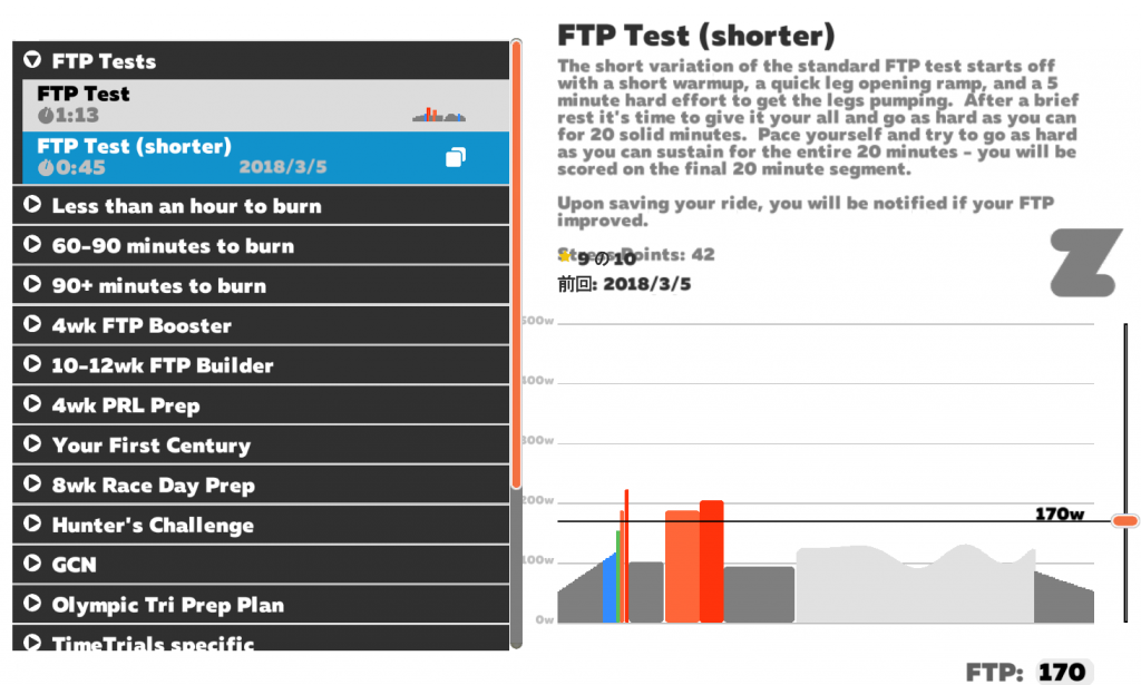 JUGEMテーマ:ロードバイク総合 3/4に初Zwiftライドしました。 とりあえず無料の間にFTP計っとこう、ということでワークアウトの【FTP Test (shorter)】を実行しました。 約5年ぶりくらいのFTP計測でしたがその結果は・・・ FTP:170W ・・・うん、知ってた。 経験があっても数年やってなければ、そりゃ一般人レベルまで体力は落ちてるよね。 ちなみにFTP計測中に1回出力が0になってるのは、部屋に放置してたビニール袋がホイールに絡むトラブルが発生したた...