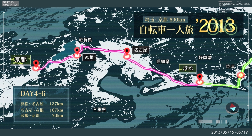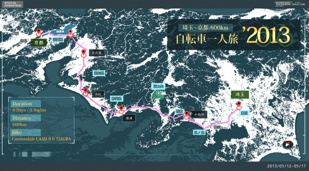 DAY1 2013年5月12日 埼玉〜京都を6日間で走破する自転車旅は、やや遅めのスタートを切った。 午前中はのんびりとメジャーリーグ中継を観ていた。 しかしいざ試合が終わって出発しようとしたら、荷物が不準備だったり、玄関を出てから忘れ物を取りに戻ったりとワチャワチャしてしまった。 これからの長い行程を思うと先が思いやられる。その一方で、スタートがゆっくりなのにもそれなりに理由があった。 初日のゴールは神奈川県の小田原市。宿...