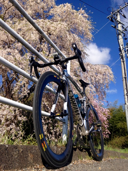 日曜は肌寒い早朝から三春ダムへGO! 桜は満開から散り始め。 滝桜は7時前から見物渋滞でうんざり。 ダムの周りをチョロチョロ走り、桜と一緒にパチリ。 本当はスピード系のトレーニングをしたかったのだけど残念。 なので、一番高価なホイールを履いてきたのですが無駄でした…。