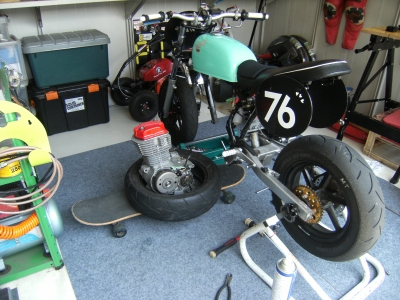 そんなわけで、筑波耐久茶屋5時間耐久ロードレースに向けた車両整備を行ないました。 ノーマルST100クラスのレギュレーションにあわせるために、いまさらながらの仕様変更です。 純正のエアークリーナーボックスを取り付けたり、ブローバイシステムの変更を行ないました。 テクニカルアドバイザーKD店長に寄与して頂いたチェーンガードなどの純正パーツを取り付けました。 リアサスペンションはエイプ100用からXR100M用に変更。 レギュレーションで許された範囲内での改良を行ないます。 フロントの接地...